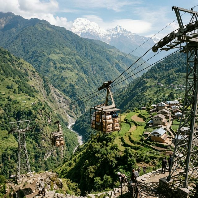 Ropeway systems designed to transport goods across the hilly and mountainous terrain of Nepal — a lifeline for remote communities.